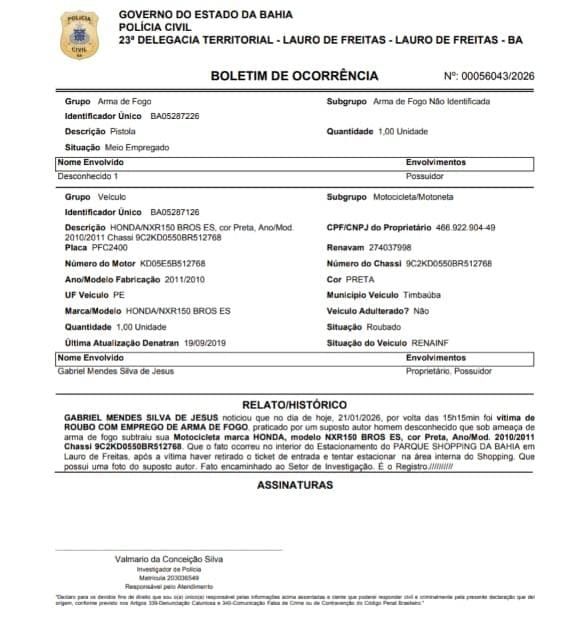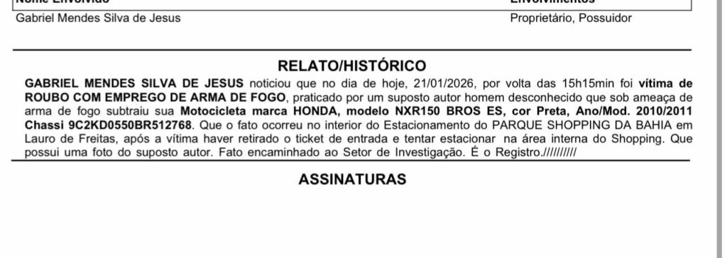 Serviço de inteligência do Grupo Shock esclarece falsa acusação de roubo de motocicleta o serviço de inteligência da empresa de segurança Grupo Shock desmascarou uma acusação falsa envolvendo um suposto roubo de motocicleta ocorrido no estacionamento do Parque Shopping Bahia.Após investigação interna, foi constatado, por meio da análise de imagens do sistema de videomonitoramento, que o fato não ocorreu conforme relatado pela suposta vítima, não se configurando, portanto, o crime de roubo.O caso encontra-se sob apuração da 23ª Delegacia Territorial, que conduz as investigações para o devido esclarecimento dos fatos.
