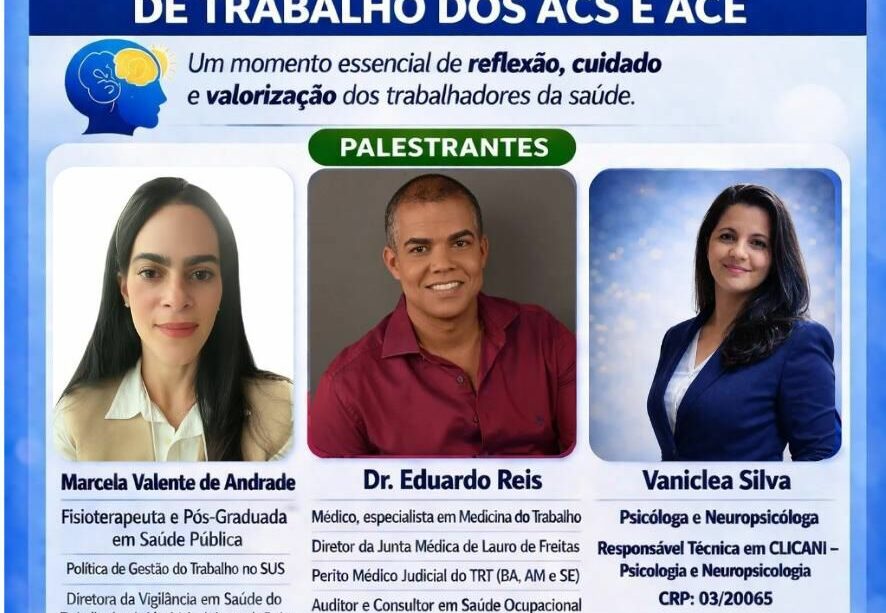 Os Agentes Comunitários de Saúde (ACS) e de Combate às Endemias (ACE) do município participam, nesta sexta-feira (17/4), de uma palestra sobre saúde mental no ambiente de trabalho. O evento, promovido pelo Sindicato dos Agentes Comunitários de Saúde e Agentes de Combate às Endemias da Bahia (SINDACS-BA), em parceria com a Prefeitura de Lauro de Freitas, por meio da Secretaria Municipal de Saúde (SESA), acontece a partir das 8h, no Centro Estadual de Educação Profissional em Tecnologia, Informação e Comunicação (CEEPTIC).