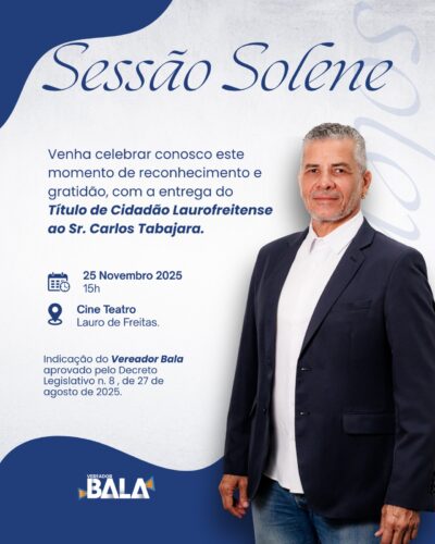A Câmara Municipal realizará, no dia 25 de novembro, no Cine Teatro Lauro de Freitas, a Sessão Solene de entrega ...Prefeitura promove reunião sobre coleta de dados da Consulta Pública do Plano de Mobilidade Urbana