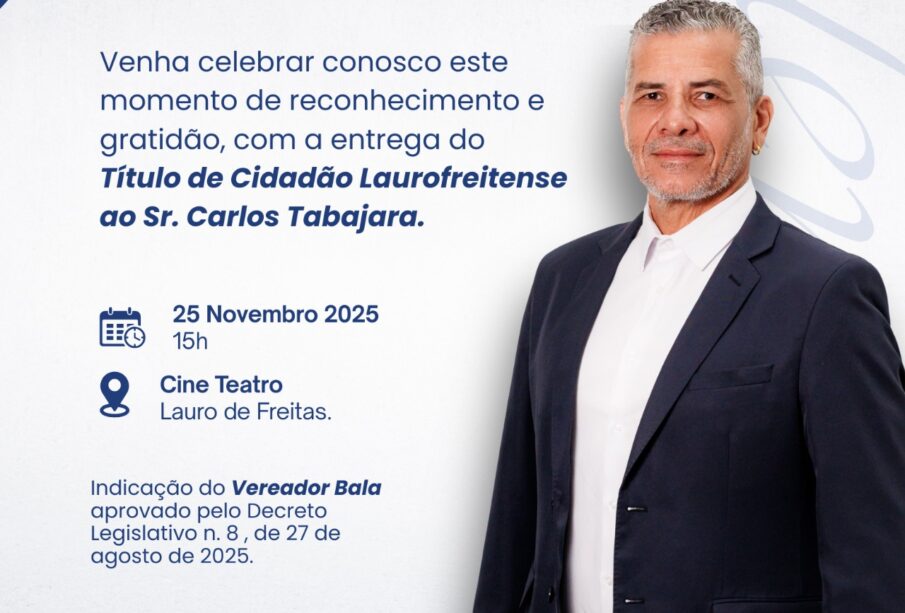 A Câmara Municipal realizará, no dia 25 de novembro, no Cine Teatro Lauro de Freitas, a Sessão Solene de entrega do Título de Cidadão Laurofreitense ao senhor Carlos Tabajara Pinho de Souza, por indicação do vereador Juraci Santos – Bala(União Brasil).