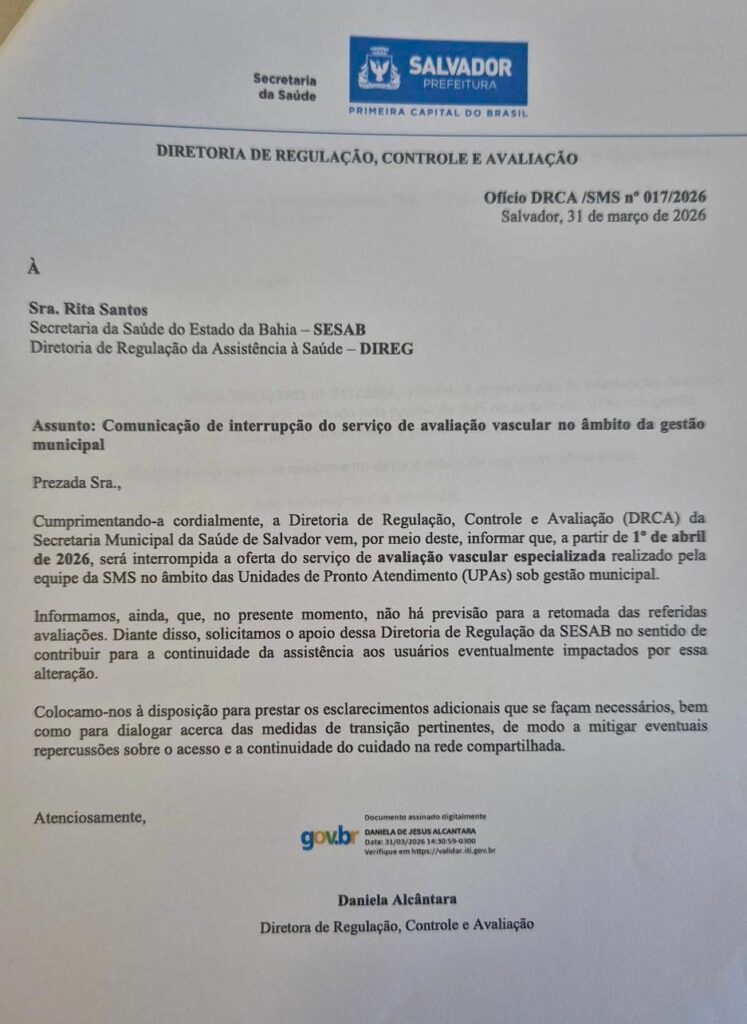 A Secretaria da Saúde do Estado da Bahia manifesta preocupação diante da decisão da Prefeitura de Salvador de suspender a oferta do serviço de avaliação vascular especializada nas Unidades de Pronto Atendimento sob gestão municipal.